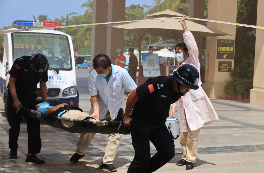 據悉,此次演練以“暴徒”襲擊游客為背景,模擬了景區(qū)遭遇恐怖襲擊時可能出現的各種突發(fā)情況,包括暴徒襲擊、人員受傷、突發(fā)大火等情況。在演練過程中,天涯海角游覽區(qū)迅速啟動《生產安全事故綜合應急預案》,在預期時間內快速抓獲暴徒,對受傷的游客與員工進行了救援,并消滅了大火。